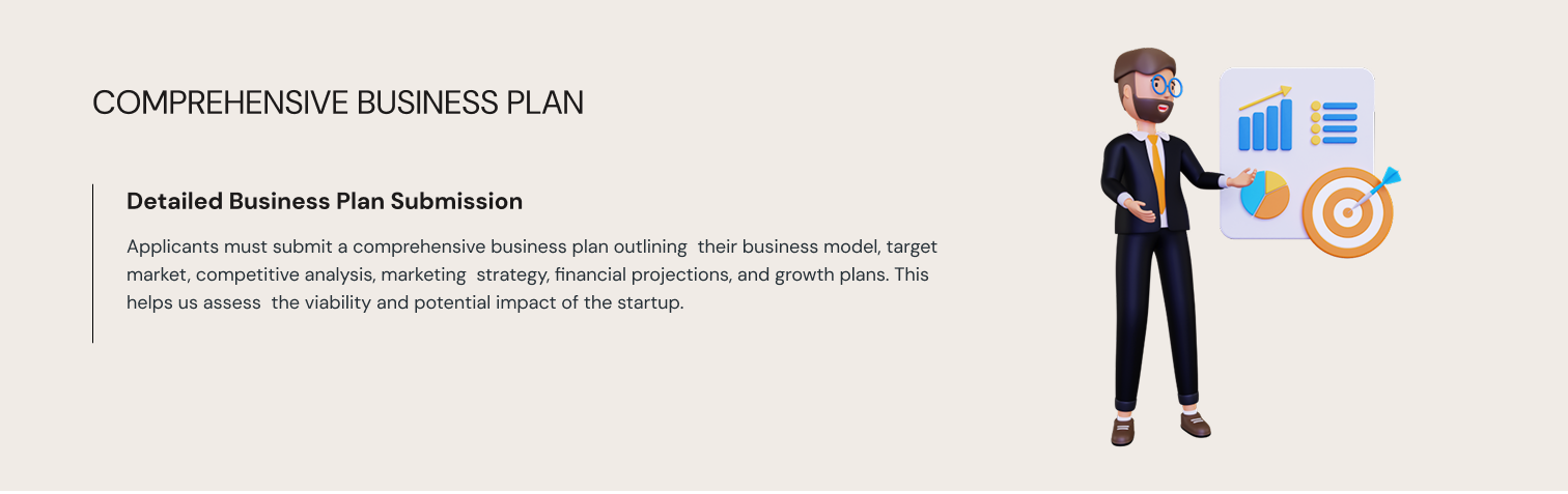 Applicants must submit a comprehensive business plan outlining their business model, target market, competitive analysis, marketing strategy, financial projections, and growth plans. This helps us assess the viability and potential impact of the startup.